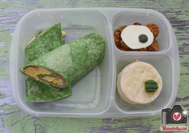 For my fifth grader, I packed Somersault Sunflower crackers topped with a green egg made from chocolate and an Unreal dye-free chocolate candy, green egg pita rounds filled with hummus and topped with a piece of cucumber and a green egg wrap (green dye-free tortilla, ham and eggs). He also packed ice water.